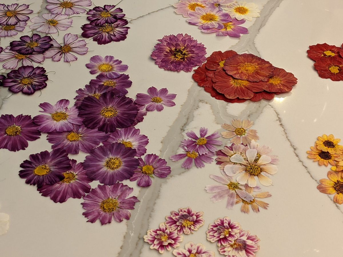 By my third growing season, my pandemic garden was bursting with flowers. I decided to experiment with pressing, just for fun. I started with a microwave press and became completely obsessed. I pressed every type of flower and foliage from my garden and more that I scavenged from wherever I could find them. I was mainly interested to see if there were any limits on what I could press, from delicate cosmos to puffy dahlias. I experimented for months, pressing hundreds if not thousands of flowers.